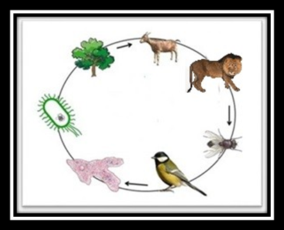 When following the biological cycle pictured above in a clockwise direction, starting with the green bush at the top left, a story can be told of how nutrients flow from one species to another. First, the bush extracts water and minerals from the soil and with the help of the Sun and atmosphere produces tender leaves some of which are consumed by the goat to build its muscle, maintain its growth, and hopefully also give birth.