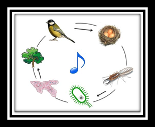 Living cycles are not limited to food, either. They can be observed in nest building, territory, and so on. The biological cycle graphic below shows the cycle for a bird building a nest in a tree. When the eggs hatch, the nest may fall to the ground where insects break it down and pass on the resulting matter to amoebas and bacteria which will return the nutrients to the soil to be used by the bush.
