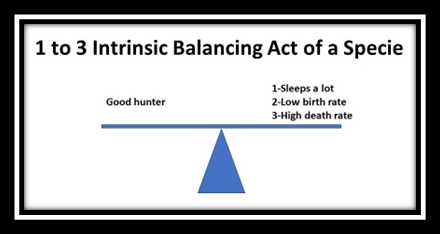 The balancing act is not restricted to a single species but may include two or more species. The slide above shows a balancing act between a predator and its prey where a good hunter may sleep a lot and the prey can run faster than the hunter.